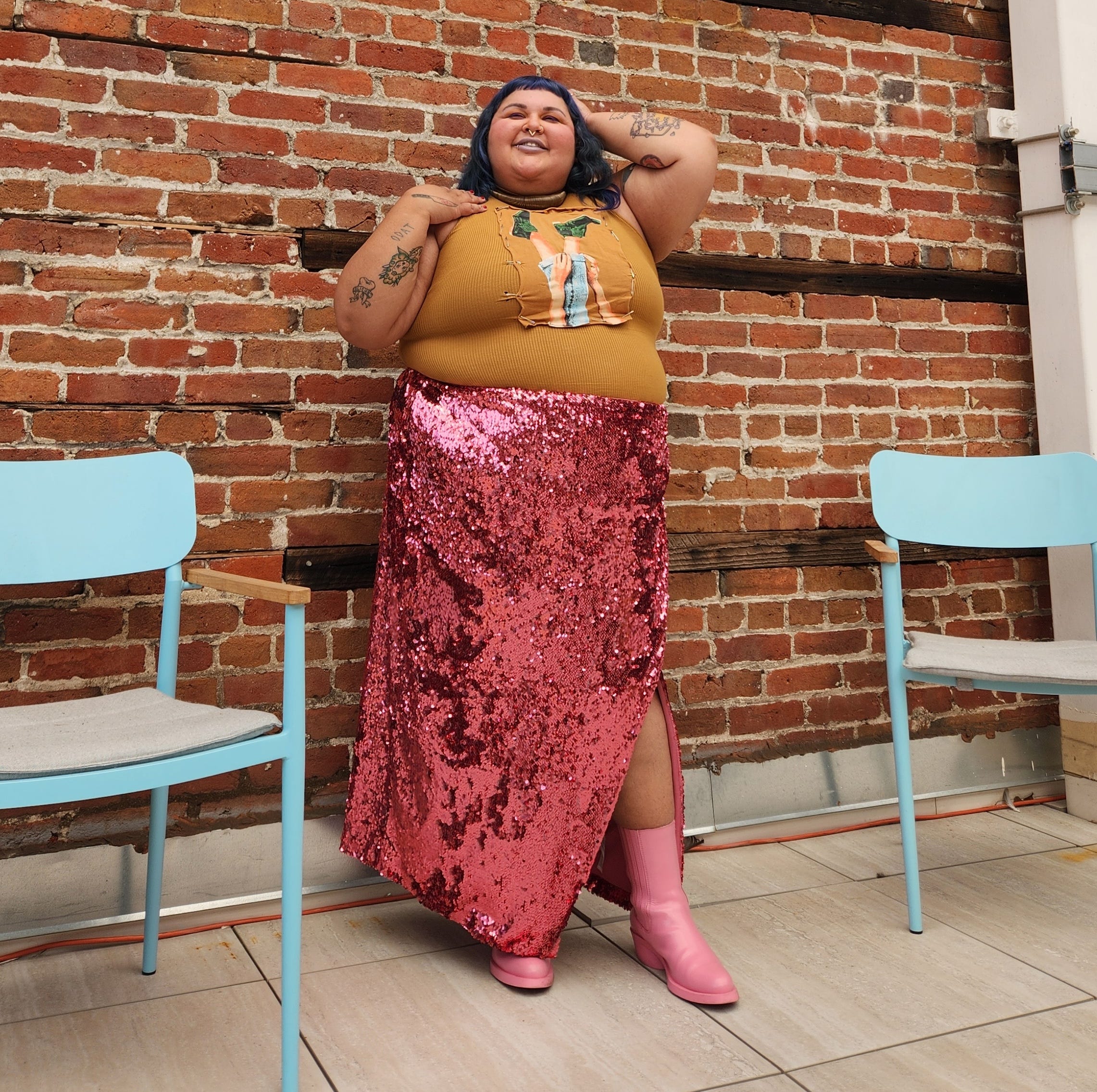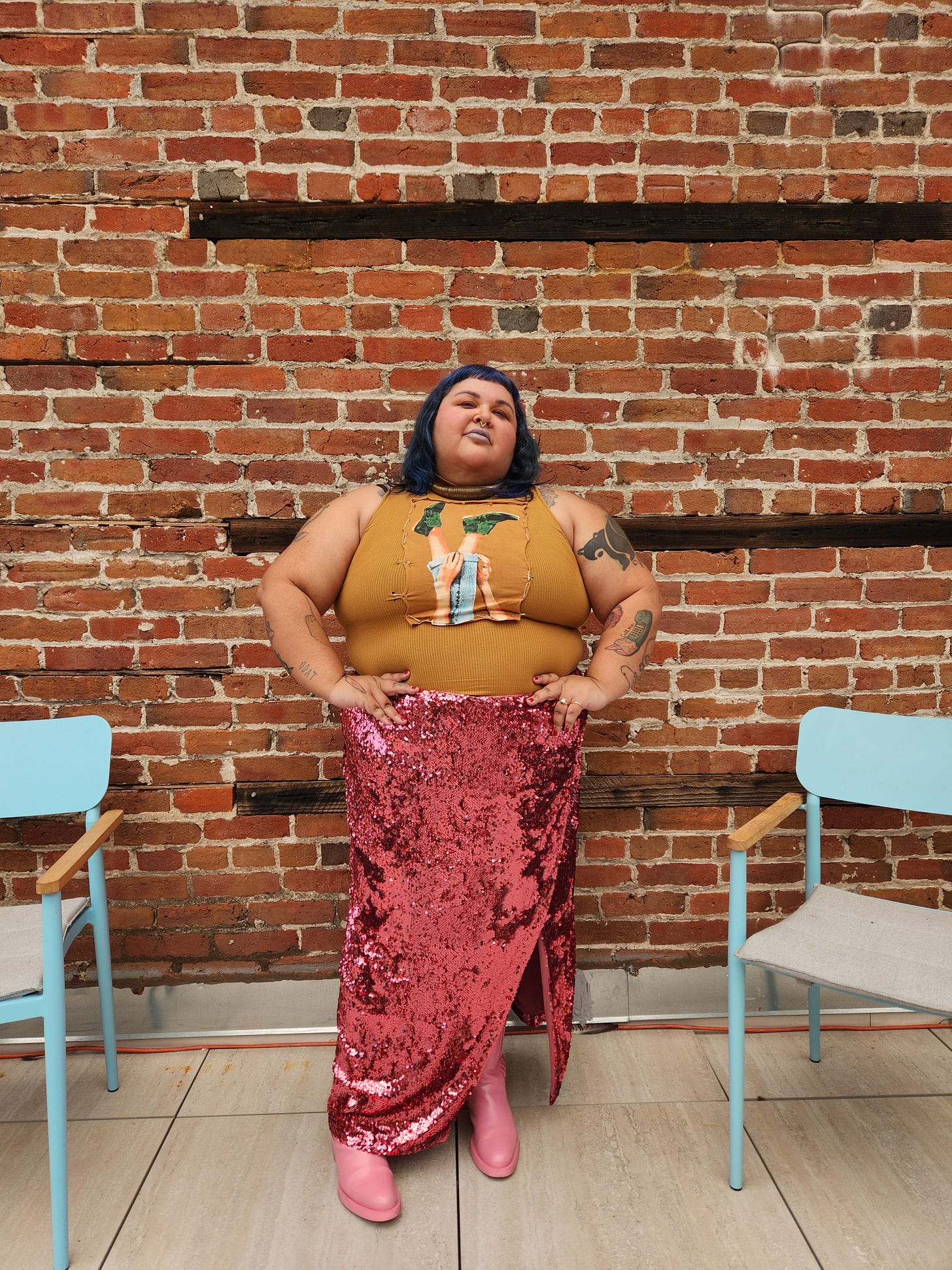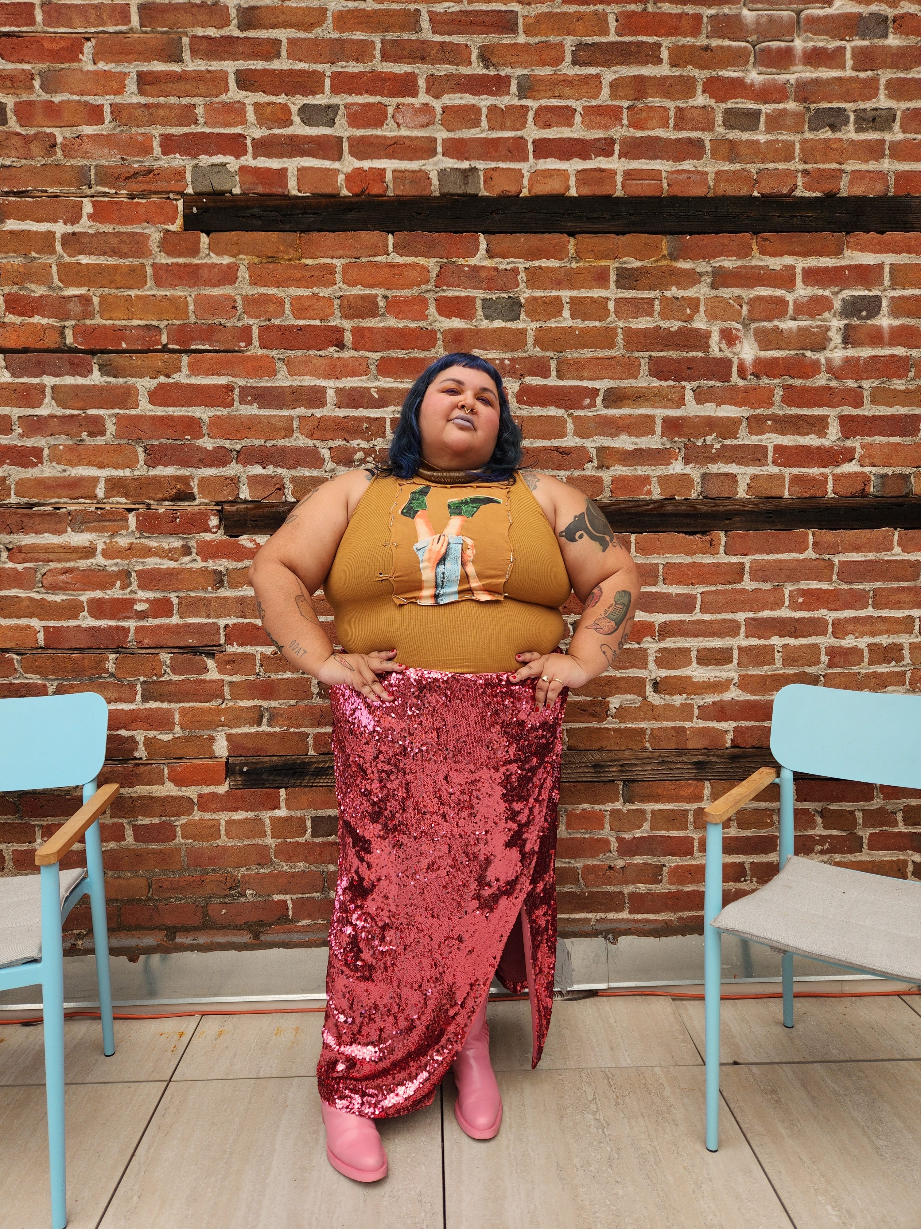 This is in essence the story behind this look. The Eloquii skirt (a ThredUp find) evoked some celebratory vibes and I decided to keep that going with bubblegum pink boots.